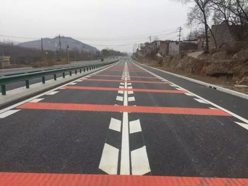 工程路線設計考慮人、車、路、環境四大要素,體現了以人為本的差異化設計理念。項目優化調整了路線指標,沿線除設置縱向振動標線外,橫向還設置了更加醒目的紅色振動標線,既提高了車輛行駛的安全性,又提升了標線視覺上的警示功能。