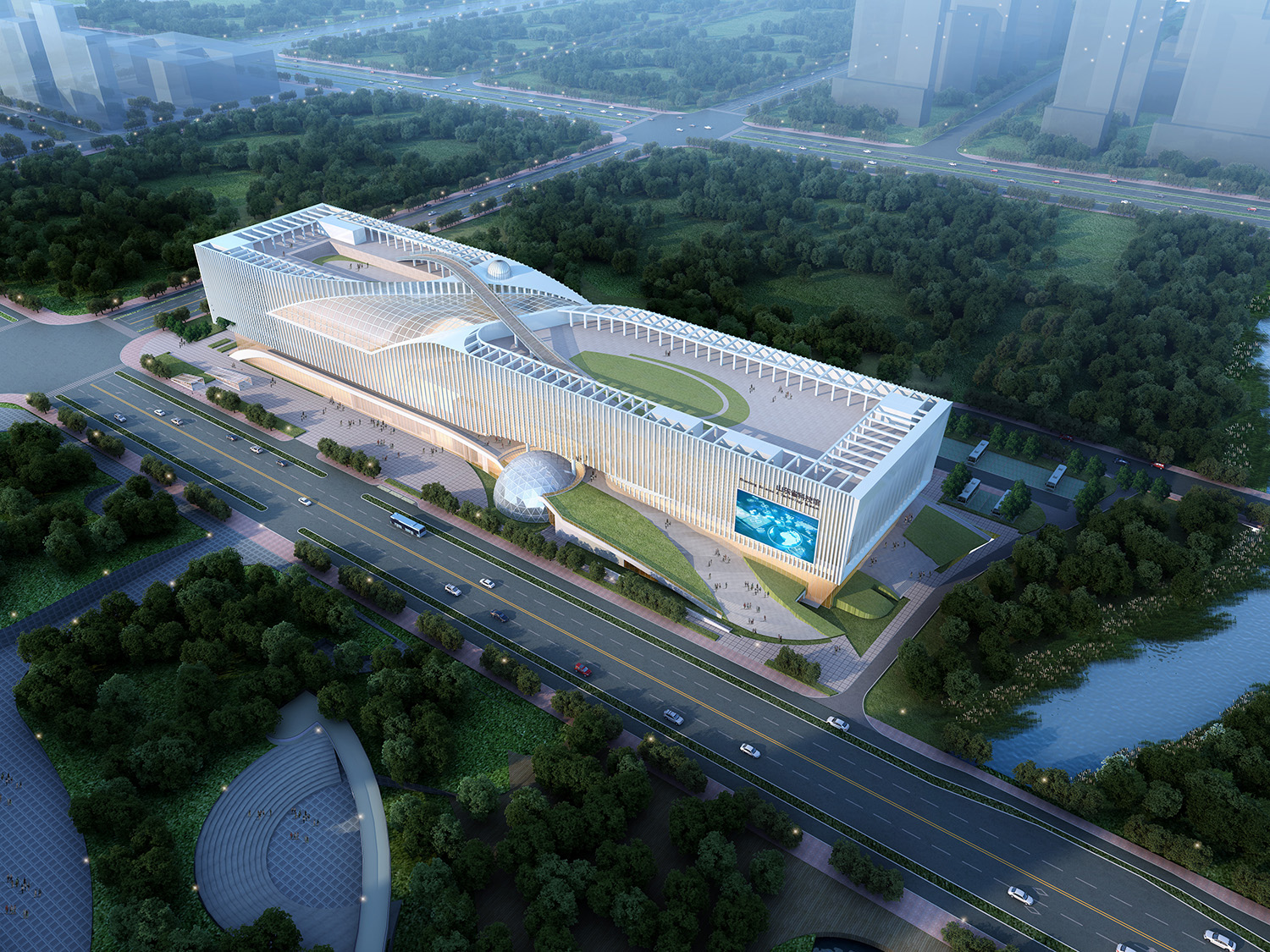 山東省科技館新館建筑將數學符號“∞”嵌入形體,意即"無限",隱喻隨著社會進步,科技領域無限未知、無限發展并有無限可能。項目整個形體簡練、抽象、完整,既充盈著科學氣質,又流露出海岱文化中的山水意蘊,提出了"山海無限"的設計理念,含蓄表達了齊魯文化中的厚重與靈動,力求建筑與自然交融,科技與生活交融,使文化、自然、生活融為一體。