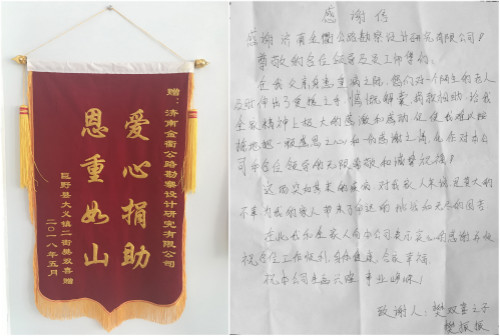 5月24日,菏澤市巨野縣大義鎮(zhèn)二街樊雙喜委托家人專程來到濟南金衢公路勘察設(shè)計研究有限公司,將一面寫有“愛心捐助 恩重如山”的錦旗和一封感謝信送到公司工作人員手中,借此表達對濟南金衢公司全體員工對樊雙喜一家及時伸出援助之手、慷慨解囊渡難關(guān)的感激之情。