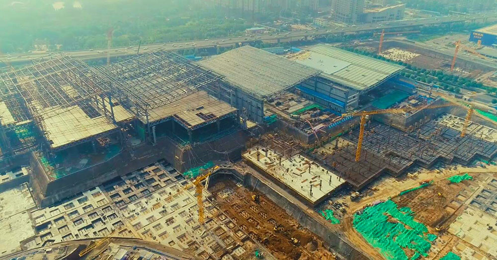 目前,展館區域主體鋼結構進入收尾階段,其中4號館、5號館已完成主體結構驗收,已全面轉入金屬屋面、幕墻外圍護體系及室內裝飾、安裝施工階段;1號館、2號館及3號館主體鋼結構施工正處于收尾階段;整個展館區域計劃6月底主體結構封頂。