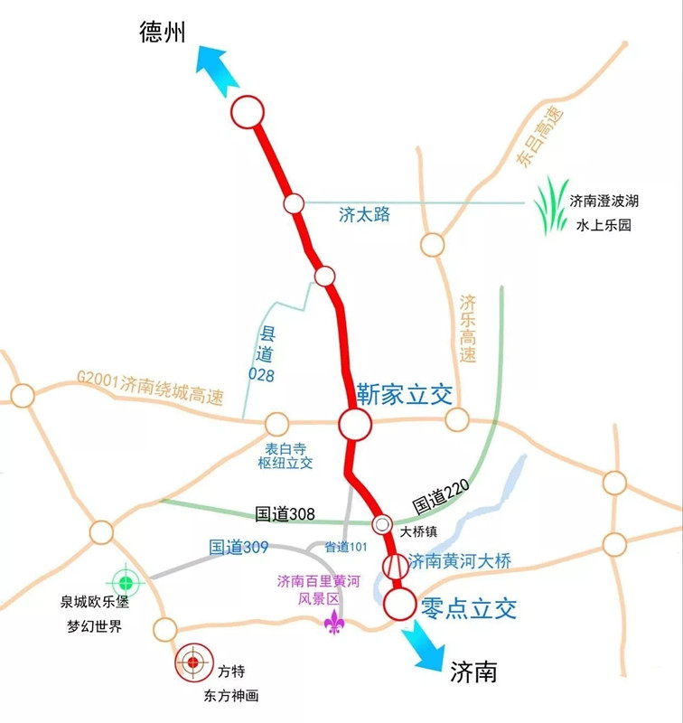 G104京福線濟南德州界至大橋鎮段改建工程全長29.69公里,起于德州市臨邑縣夏口大橋南,途經濟陽縣太平鎮、孫耿鎮,止于天橋區大橋鎮G220、G308交叉口,一級公路標準,設計時速80公里/小時。