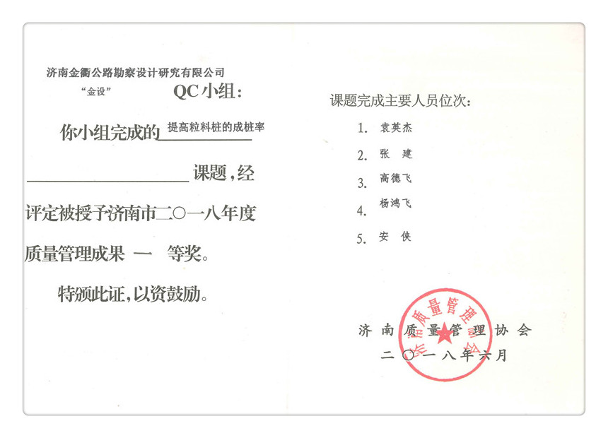 近日,濟南質量管理協會組織召開了2018年度全市群眾性質量管理活動經驗交流會,表彰群眾性質量管理活動中涌現出的優秀QC小組、質量信得過班組、先進工作者及優秀QC成果。金衢公司成立“金設”QC小組參與評選,申報的多個課題受到表彰:其中“提高粒料樁的成樁率”課題榮獲“濟南市2018年度質量管理成果”一等獎;“提高路面結構內部排水效率”課題榮獲“濟南市2018年度質量管理成果”二等獎;“公路路基滑坡治理研究”、“提高公路設計工作的效率”、“有效防止小箱梁支座脫空現象”、“提高后期服務滿意率”四個課題分別榮獲“濟南市2018年度質量管理成果”三等獎;同時,金衢公司設計一室、設計二室被授予“濟南市2018年度質量信得過班組”榮譽稱號,劉騰、王敏、張偉偉三人被授予“2018年濟南市優秀質量管理工作者稱號”。