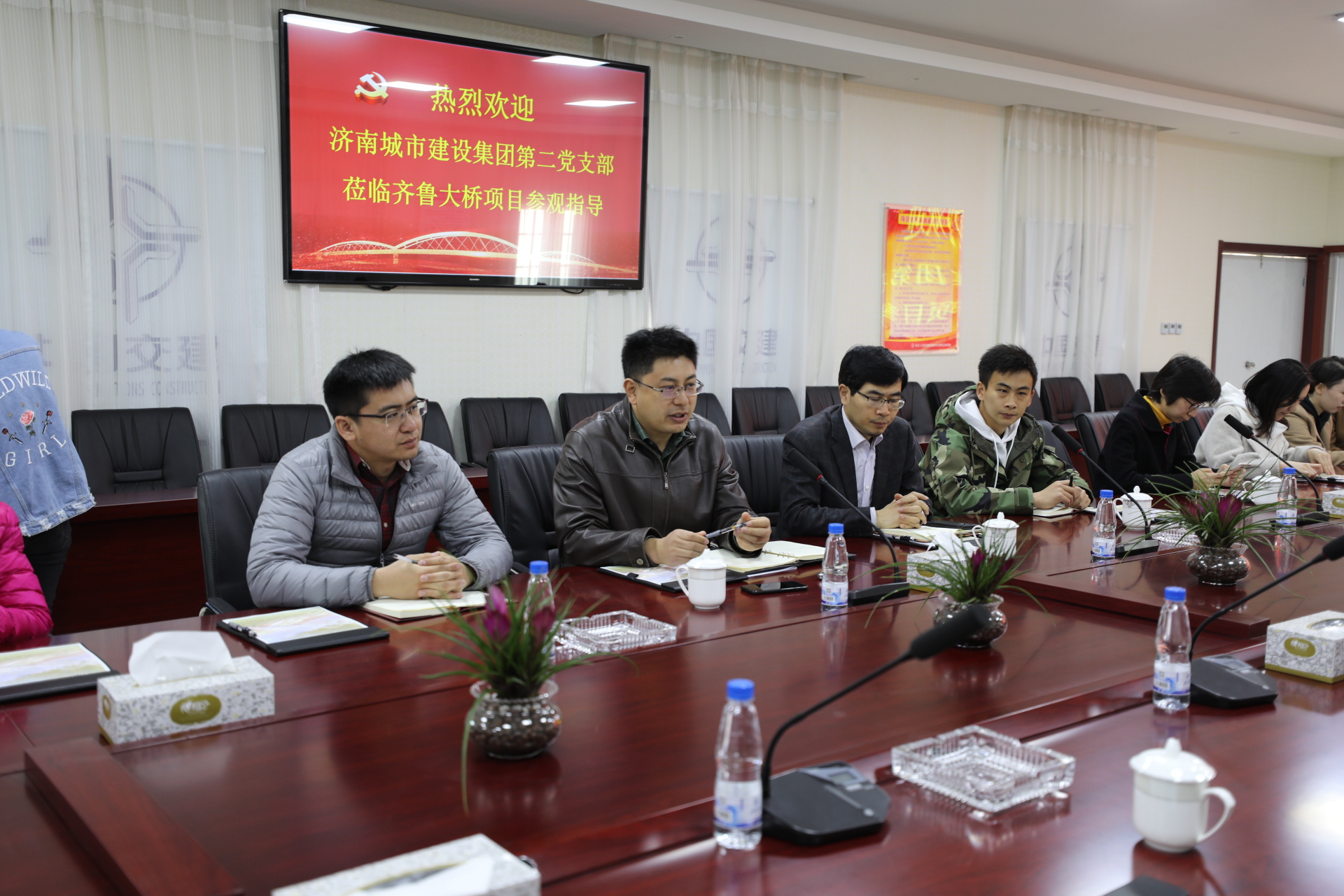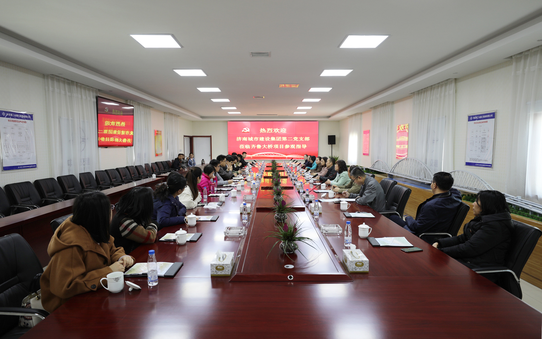 全體人員在集團總會計師范天云的帶領下,首先來到齊魯大道北延工程項目經理部,與公司副總經理趙世超及工作人員進行了座談,雙方首先介紹了各自支部情況及組織建設情況并進行了交流。隨后,項目負責人對工程進行了詳細的介紹,并參觀了齊魯黃河大橋橋梁模型、觀看了黃河大橋建設宣傳片,展示了齊魯黃河大橋的建設過程及原理。作為目前同類橋型跨徑世界第一網狀吊桿系桿拱橋,其所展現的創新技術、建成效果以及打造的“黃河橋梁文化”令人驚嘆和期待。