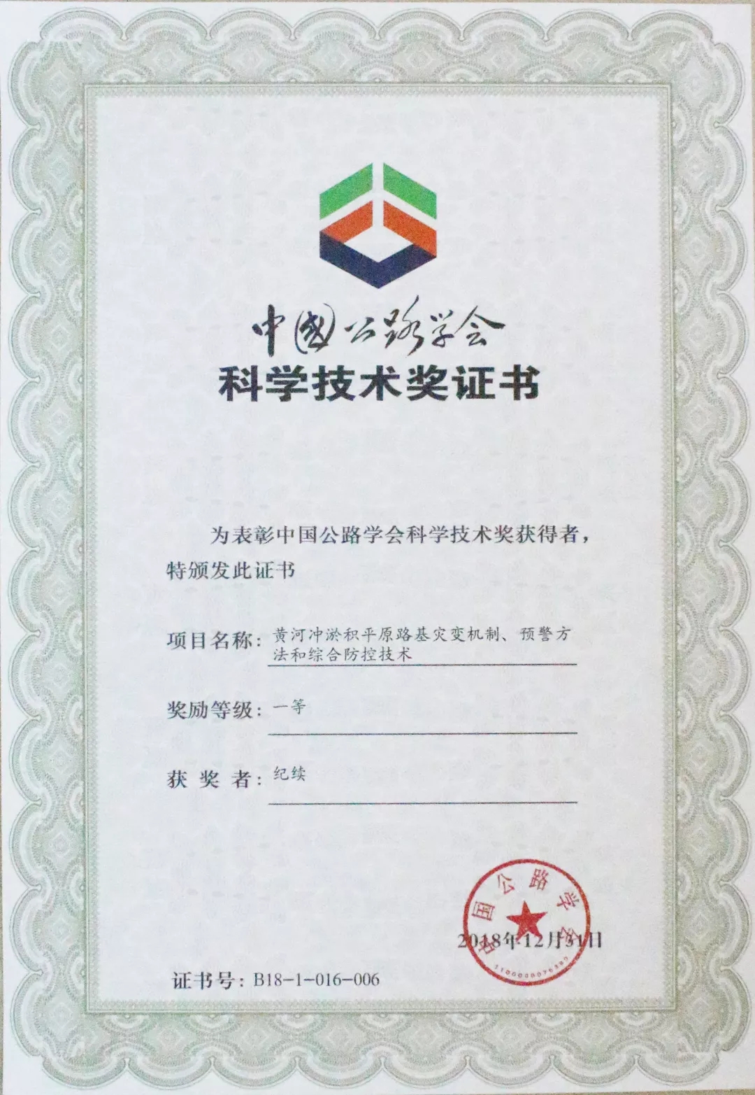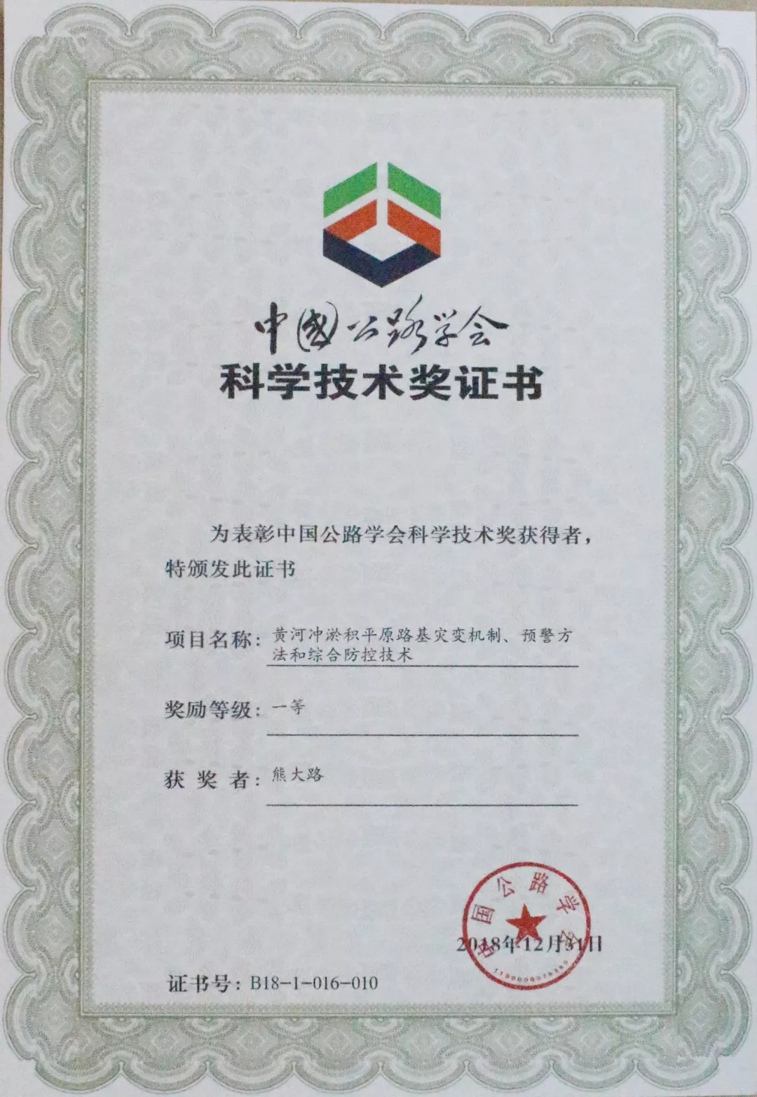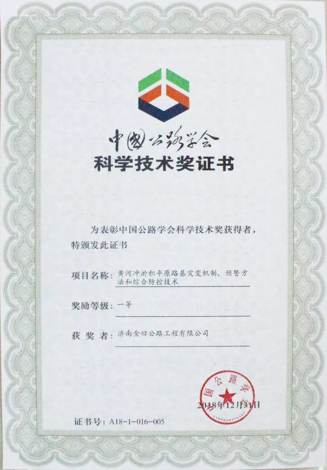 2019年6月15日,由中國公路學會組織的“2018年度中國公路學會科學技術獎頒獎大會”在北京國家會議中心召開。濟南金曰公路工程有限公司參與研究的課題《黃河沖淤積平原路基災變機制、預警方法和綜合防控技術》榮獲一等獎。