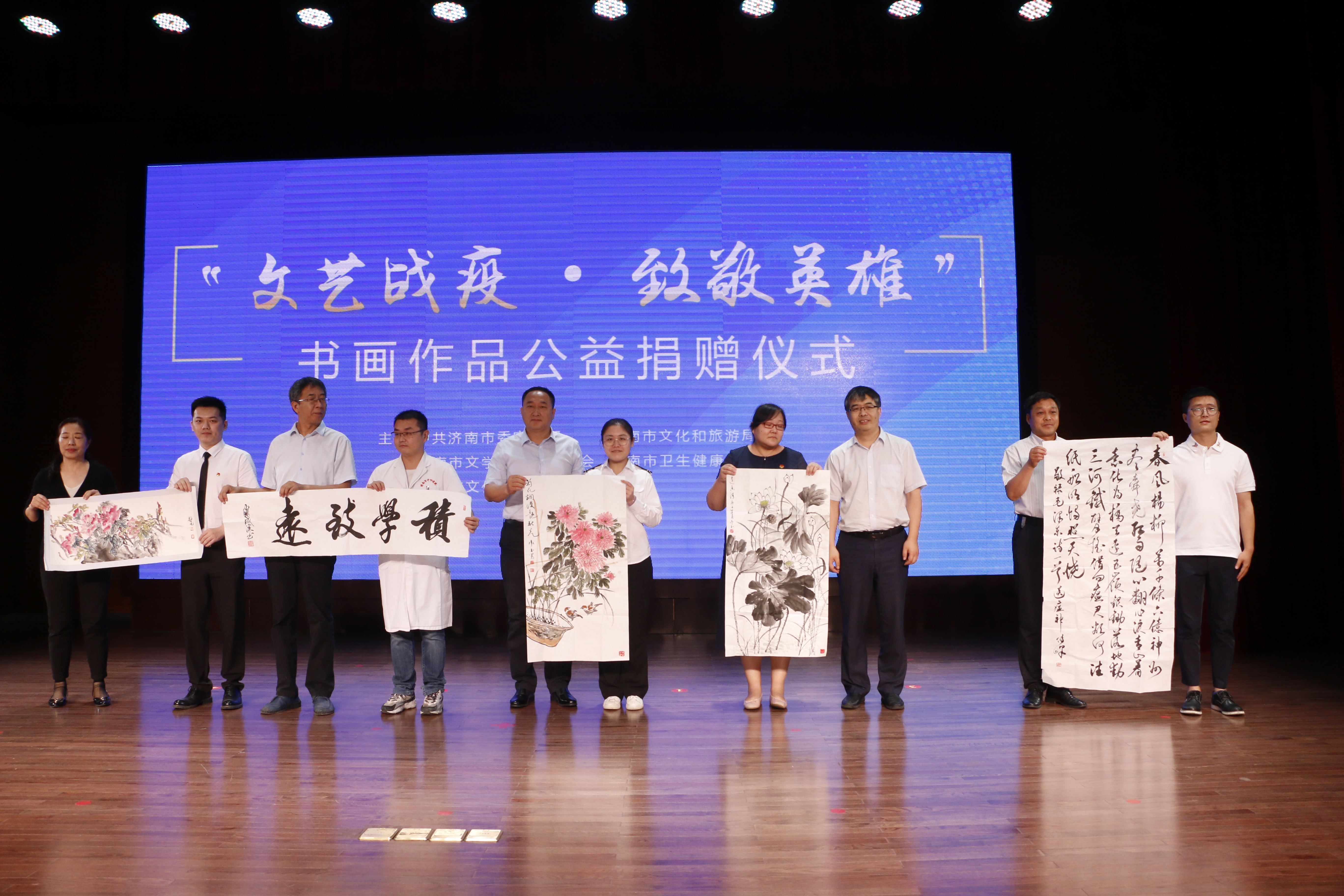 為進(jìn)一步加強(qiáng)疫情防控宣傳工作,充分發(fā)揮濟(jì)南市文藝戰(zhàn)線優(yōu)勢作用,用文藝的形式向抗擊疫情一線英雄致敬,6月9日,由市委宣傳部、市文化和旅游局、市文學(xué)藝術(shù)界聯(lián)合會、市衛(wèi)生健康委員會主辦,市文化館承辦的“文藝戰(zhàn)疫·致敬英雄”濟(jì)南市書畫作品公益捐贈儀式在市文化館多功能廳舉行。市委宣傳部、市文化和旅游局、市文聯(lián)、市衛(wèi)健委等主承辦單位相關(guān)負(fù)責(zé)同志以及書畫作品捐贈藝術(shù)家代表、援鄂醫(yī)護(hù)工作者等抗擊疫情一線的各界代表共計80余人參加活動。