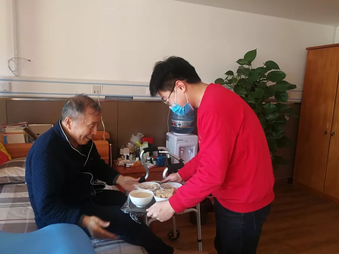 在介護區,我們還看到了兩位正在忙碌的“95后”小伙子。97年出生的陳安義,家住德州,本來已經買好了回家的車票,接到抗擊疫情的通知,第一時間退了車票主動請戰。98年出生的欒希浩,老家在煙臺,也是放棄了春節假期,跟陳安義兩人共同負責介護區二樓的四戶長者。