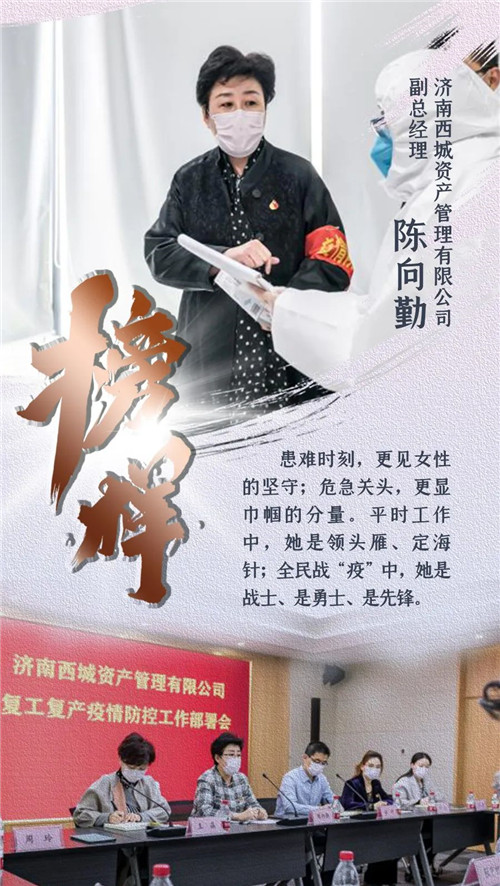 目前,濟南全面復工復產,陳向勤對疫情防控工作進行再部署、再強調、再落實,做到“十個一律”、“十個嚴禁”。她提前出手、摸底調查,切實堅守聯防聯控嚴密防線,幫助運營單位制定應對措施,關鍵時刻施以援手,保障復工復產后資產管理公司所轄寫字樓、商業綜合體的疫情防控工作萬無一失。