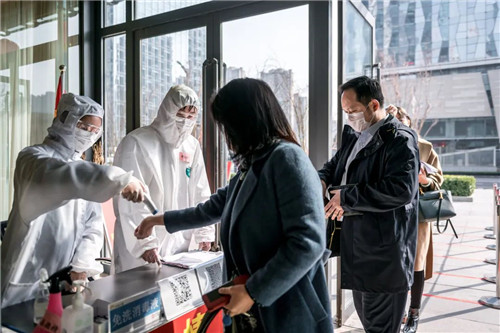 在西城大廈,從車庫電梯入口到一樓入口,身穿防護服的工作人員手拿測溫槍,對進入人員進行第一關檢驗,隨后查驗身份證通行證、身份登記、問詢、消毒,一系列流程一氣呵成,建立起防疫安全的第一道防線。