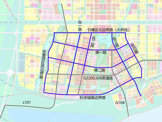 大橋組團:引爆區北邊界路(大橋段)、橫一路、橫二路、G220G308貫通路、科學城南邊界路、安置西區西邊界路、S101、縱一路、縱二路、G104、縱三路、縱四路;