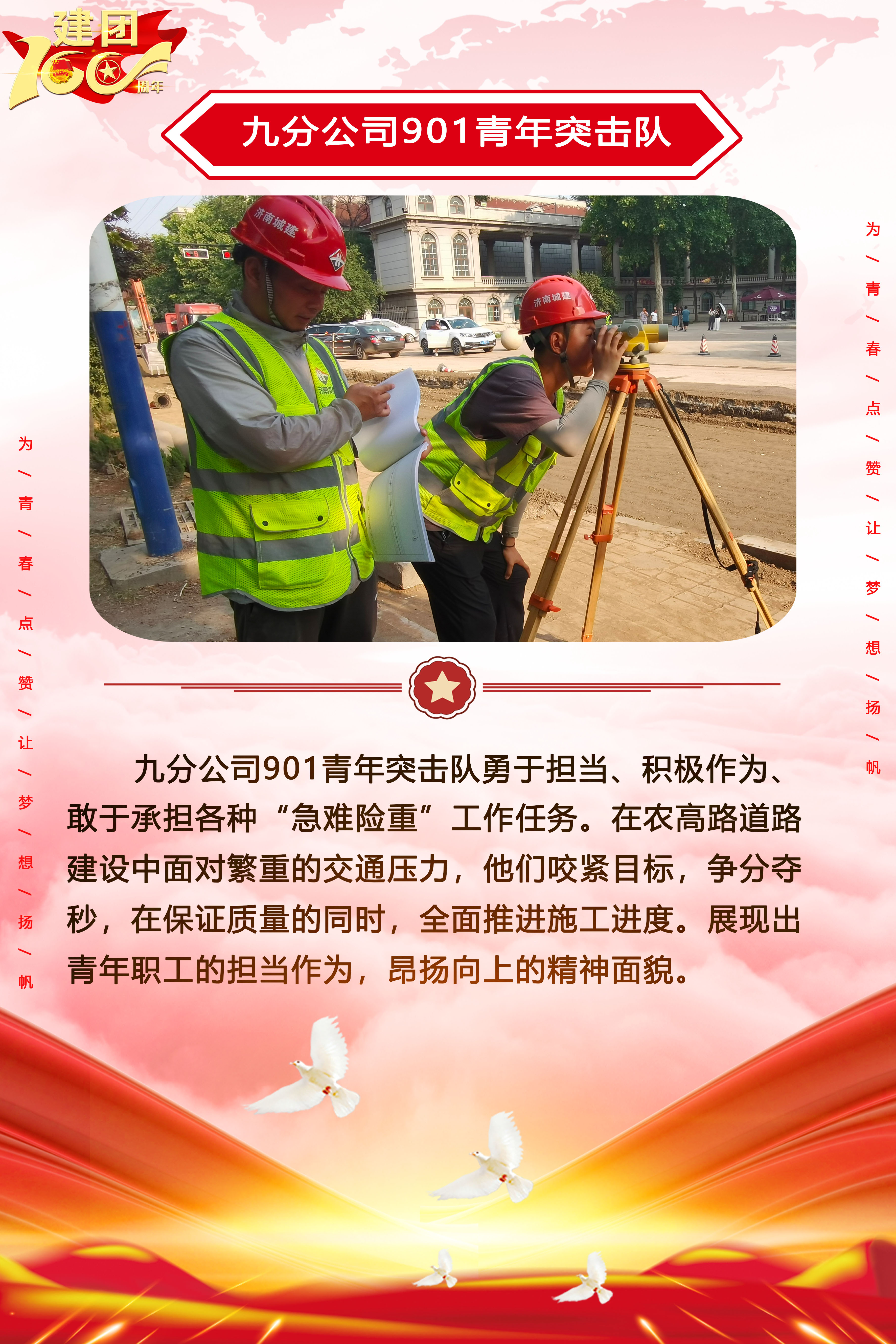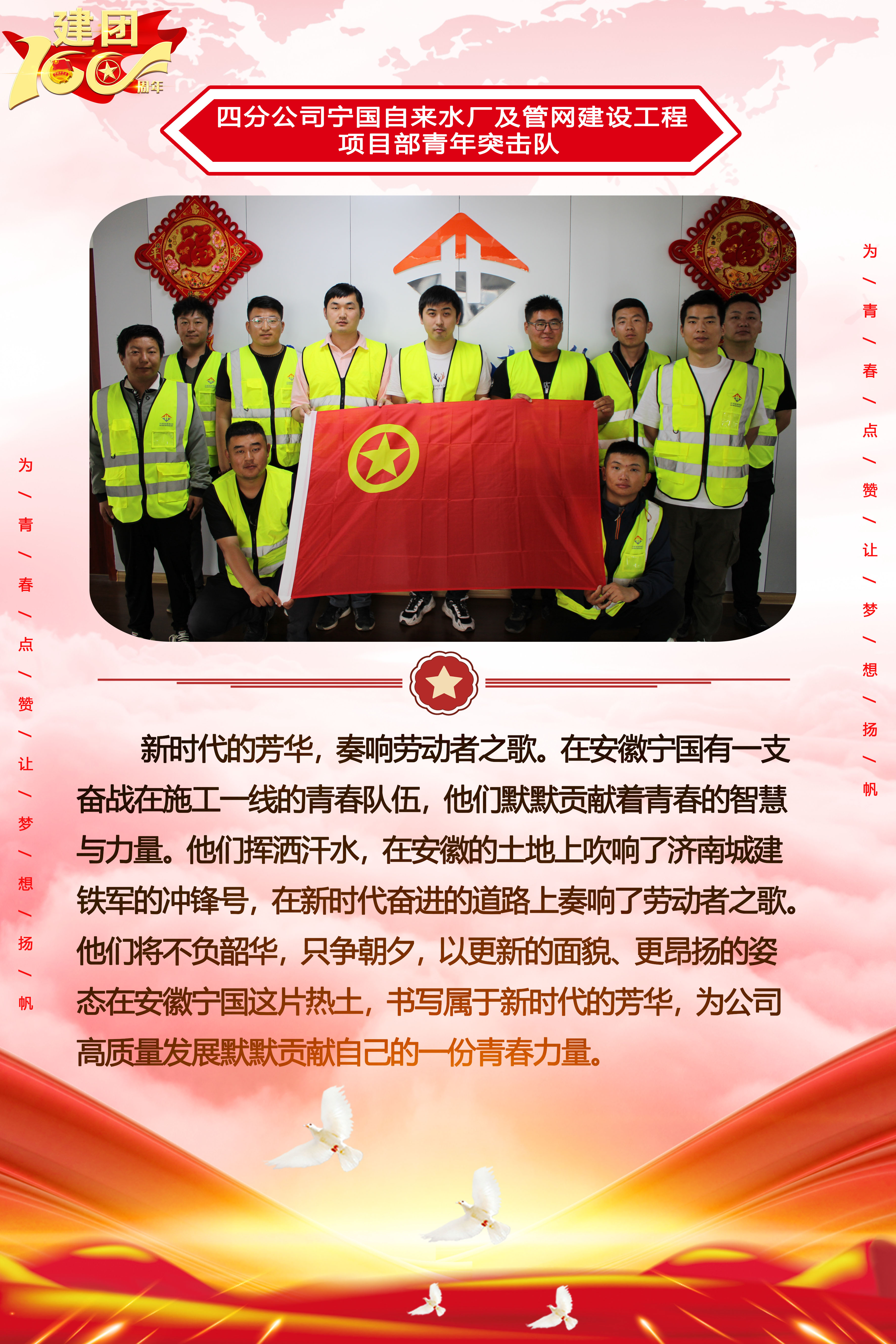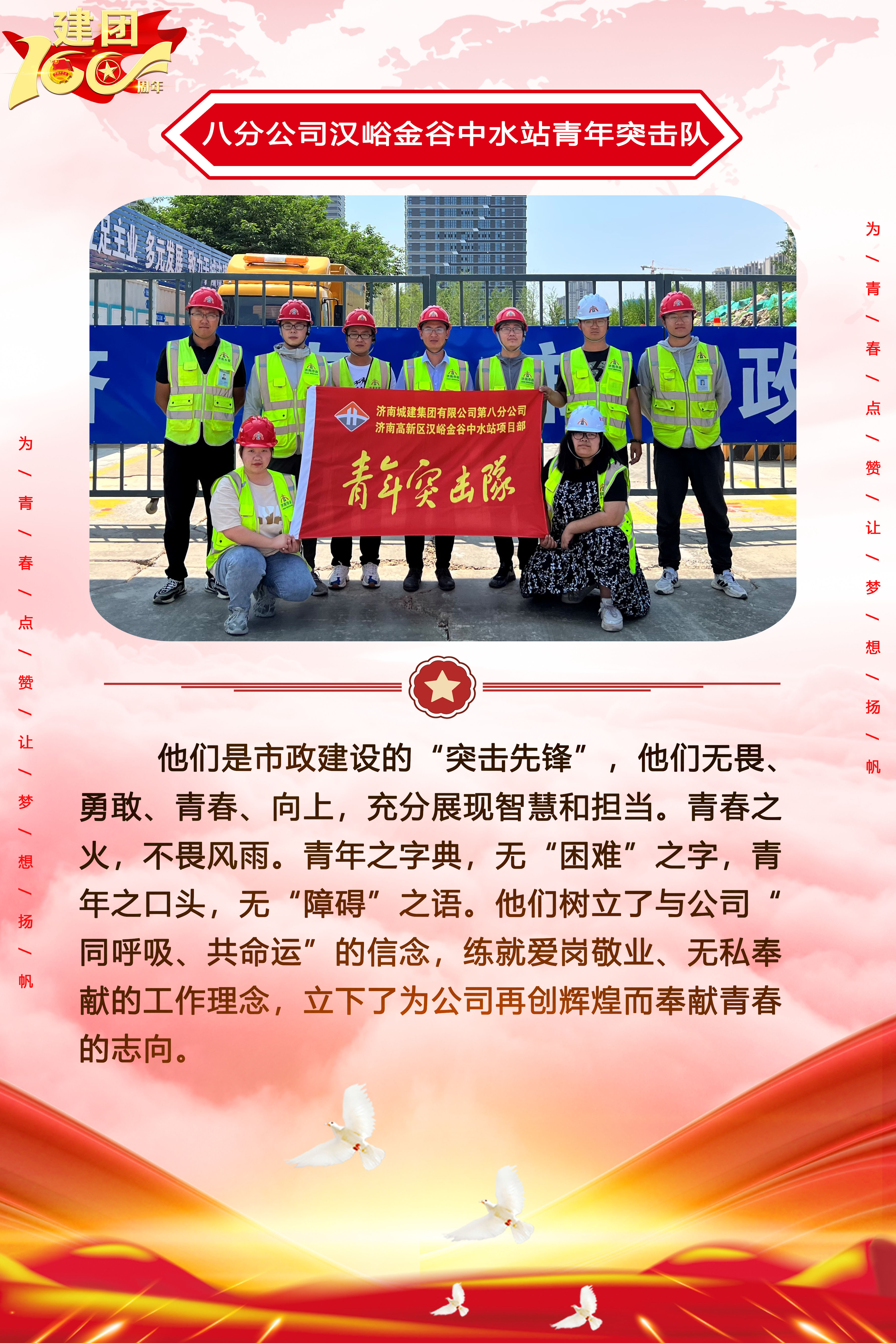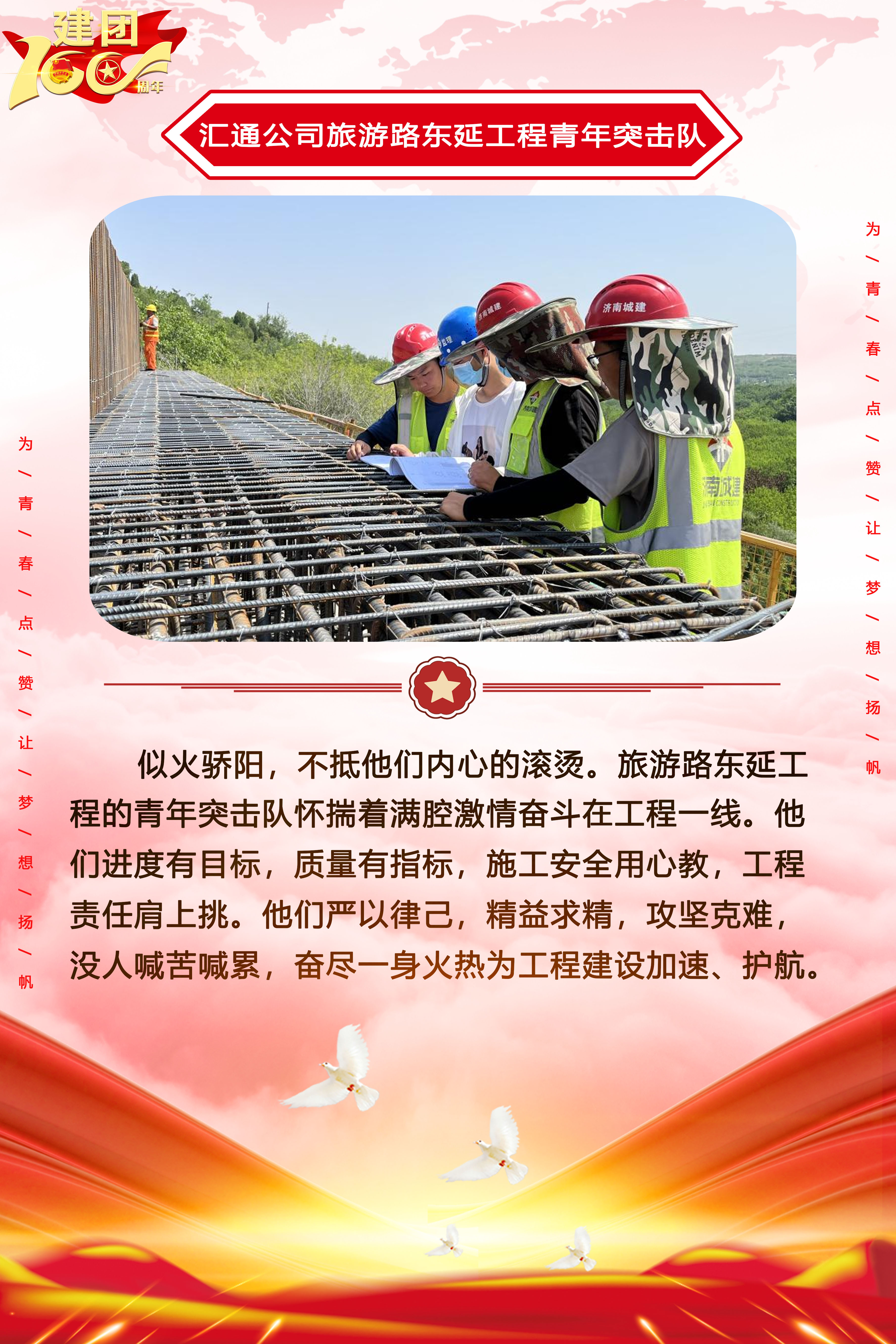 為慶祝中國共產主義青年團成立100周年,深情回顧共青團發展歷程,進一步增強廣大團員青年敬團、愛團意識,提升團組織的凝聚力和向心力,展示公司團員青年積極向上、奮發有為的精神風貌,集團第四團委——濟南城建集團有限公司團委持續開展團旗在城建飄揚合影活動。