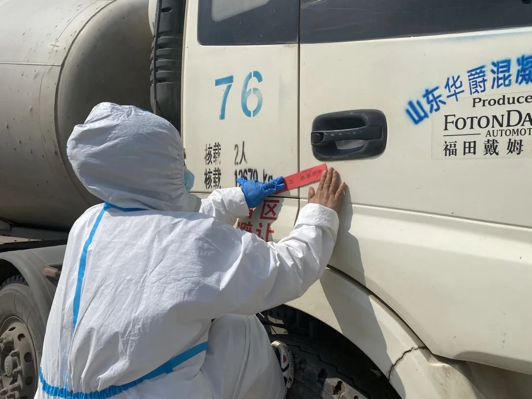 目前的建設階段,施工現場必須有鋼筋、混凝土的持續供應。工地設置了材料進場專用過渡區,對材料進行防疫消殺后才能進入現場使用。在封閉區門口,記者看到,兩輛混凝土攪拌車正準備進入現場作業。管理人員在進行必要的信息查驗登記后,在車門貼上封條,對車體消殺之后,攪拌車順利進入了現場施工。宋丹生介紹,貼封條、禁止司機下車,可最大限度避免施工人員與外界的接觸。