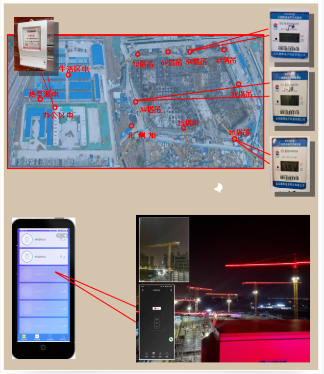 在房建類項目建設中,通過用電分區計量,將施工用電,辦公用電,生活用電均分開計量,現場8臺塔吊,均單獨計量,項目安排專人每月底抄表,做好用電臺賬,并統計分析,糾偏查因。同時通過項目部塔吊大燈遠程智能控制系統,保證施工現場無人施工時能第一時間利用APP使塔吊鏑燈,節約能源。