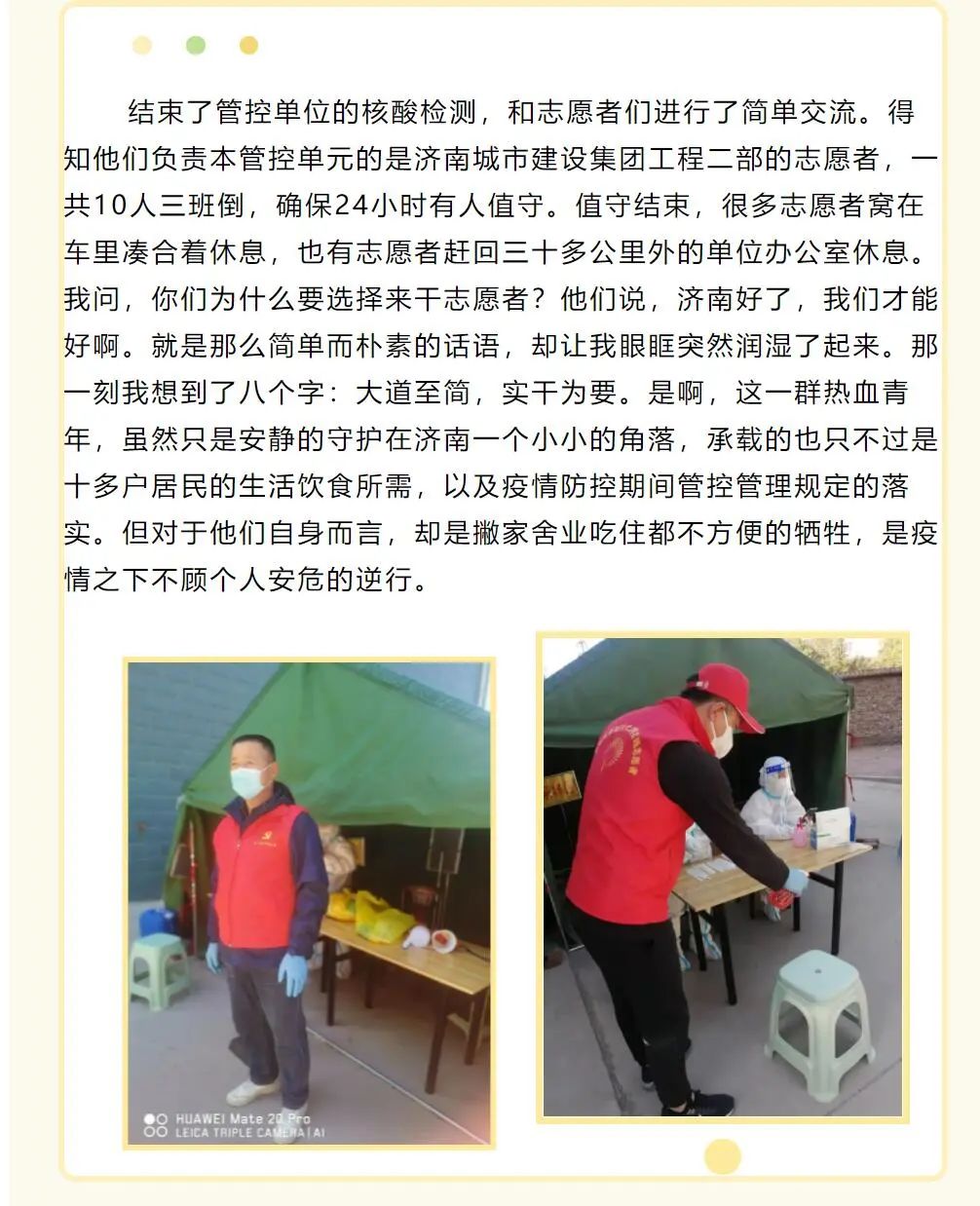 “他們說(shuō),濟(jì)南好了,我們才能好啊。簡(jiǎn)單而樸素的話語(yǔ),卻讓我眼眶突然潤(rùn)濕了起來(lái),那一刻我想到了八個(gè)字:大道至簡(jiǎn),實(shí)干為要。”近日,歷城區(qū)董家街道辦的工作人員在“愛(ài)董家”微信平臺(tái)上寫下了這樣的話,他口中的“他們”便是按照集團(tuán)統(tǒng)一部署下沉到董家街道社區(qū)的工程二部志愿者們。