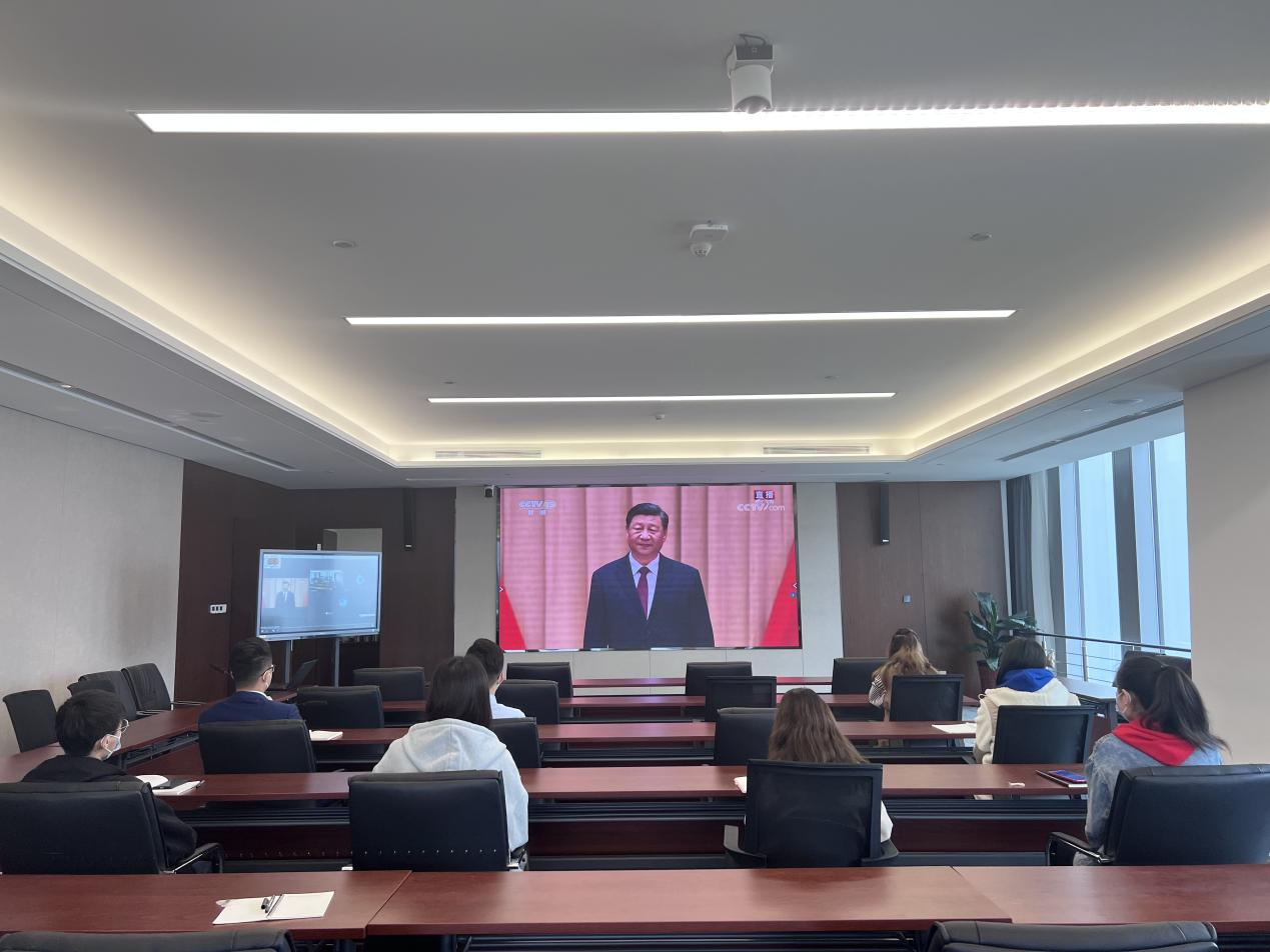 金齡健康團(tuán)支部組織青年團(tuán)員觀看中國(guó)共產(chǎn)主義青年團(tuán)成立100周年大會(huì)直播,因園區(qū)現(xiàn)處于封閉階段,此次觀看分居家辦公人員自行觀看、封閉區(qū)域團(tuán)員按照防疫要求在黨員活動(dòng)室集中觀看兩種形式進(jìn)行。