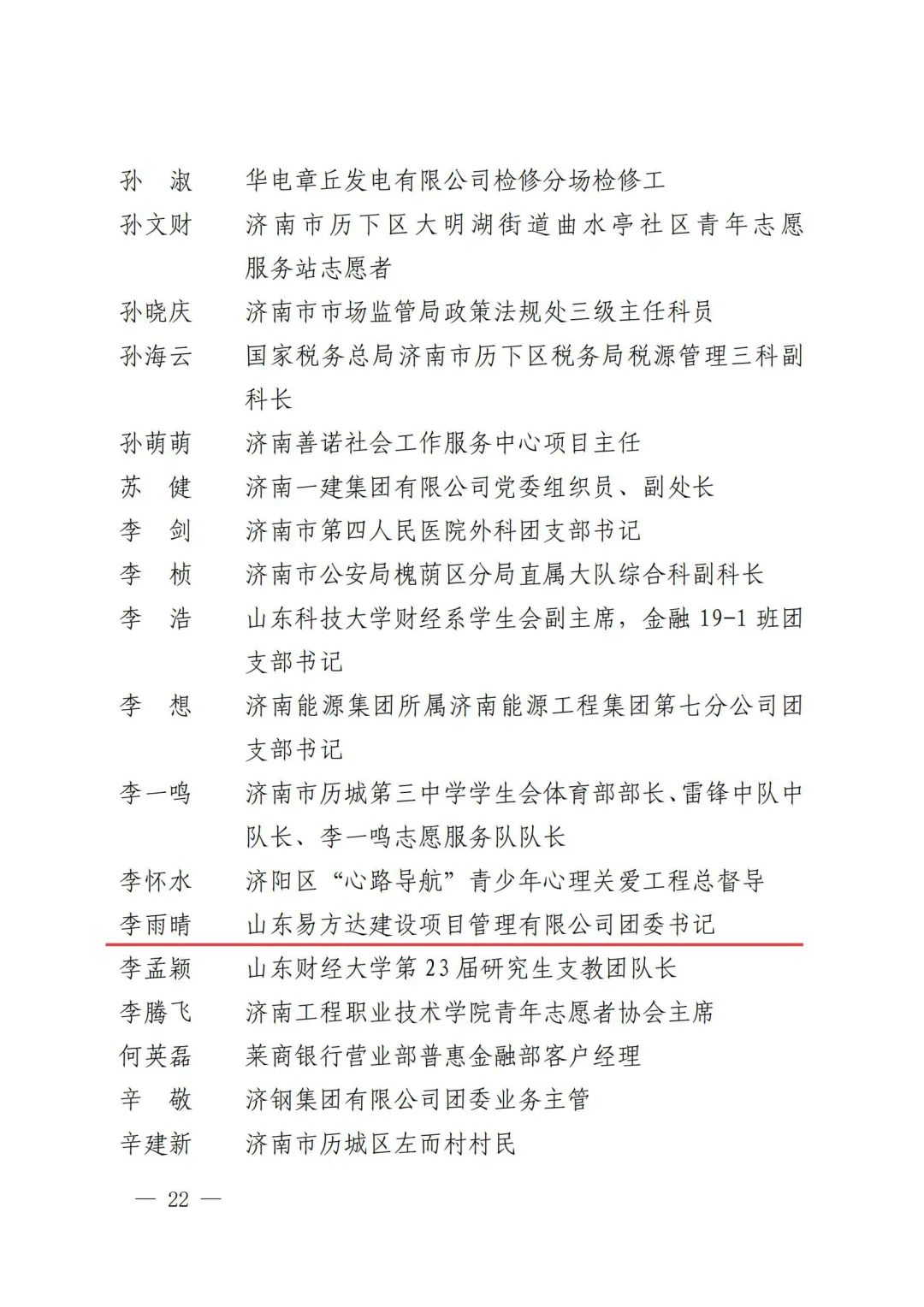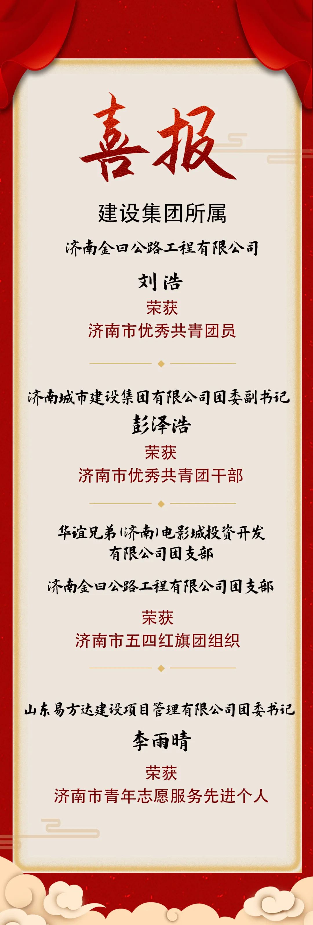 近日,共青團(tuán)濟(jì)南市委公布了《關(guān)于2021年度濟(jì)南市五四出彩典型的表揚(yáng)通報(bào)》,建設(shè)集團(tuán)團(tuán)委所屬團(tuán)組織及團(tuán)員青年榮獲“濟(jì)南市五四紅旗團(tuán)組織”“濟(jì)南市青年志愿服務(wù)先進(jìn)個(gè)人”“濟(jì)南市優(yōu)秀共青團(tuán)員”“濟(jì)南市優(yōu)秀共青團(tuán)干部”等4項(xiàng)榮譽(yù)稱號(hào)。