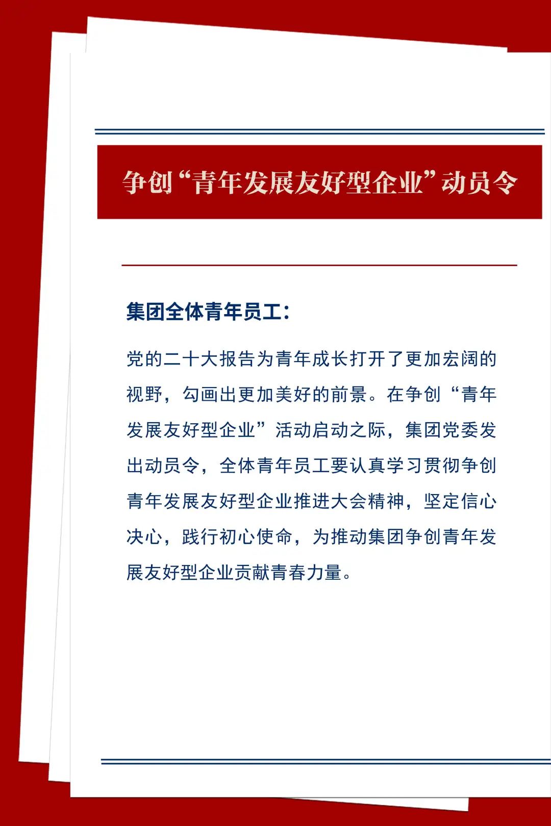 全體青年員工要以對(duì)黨和集團(tuán)高度負(fù)責(zé)的精神對(duì)待本職工作,主動(dòng)深入一線,切實(shí)發(fā)揮青年人朝氣蓬勃的精神和干勁。進(jìn)一步強(qiáng)化黨建、團(tuán)建引領(lǐng)和政治保障,提高政治站位、強(qiáng)化使命擔(dān)當(dāng),帶頭響應(yīng)集團(tuán)爭創(chuàng)青年發(fā)展友好型企業(yè)號(hào)召,主動(dòng)宣傳、引導(dǎo)、以實(shí)際行動(dòng)帶動(dòng)身邊人參與到活動(dòng)中來。
