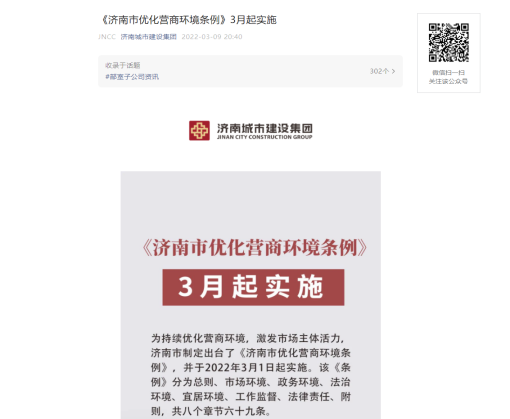 《濟南市優化營商環境條例》(以下簡稱《條例》)于今年3月1日起施行,根據市國資委《關于開展優化營商環境法治宣傳月活動的通知》要求,為貫徹實施好《條例》,持續優化營商環境,3月4日-31日,集團及各子公司積極開展了優化營商環境法治宣傳月活動。活動期間,集團在微信公眾號推送《<濟南市優化營商環境條例>3月起實施》推文,同時通過電子屏投放、制作易拉寶等多種形式進行宣傳,不斷強化干部職工優化營商環境的理念,營造良好輿論氛圍。
