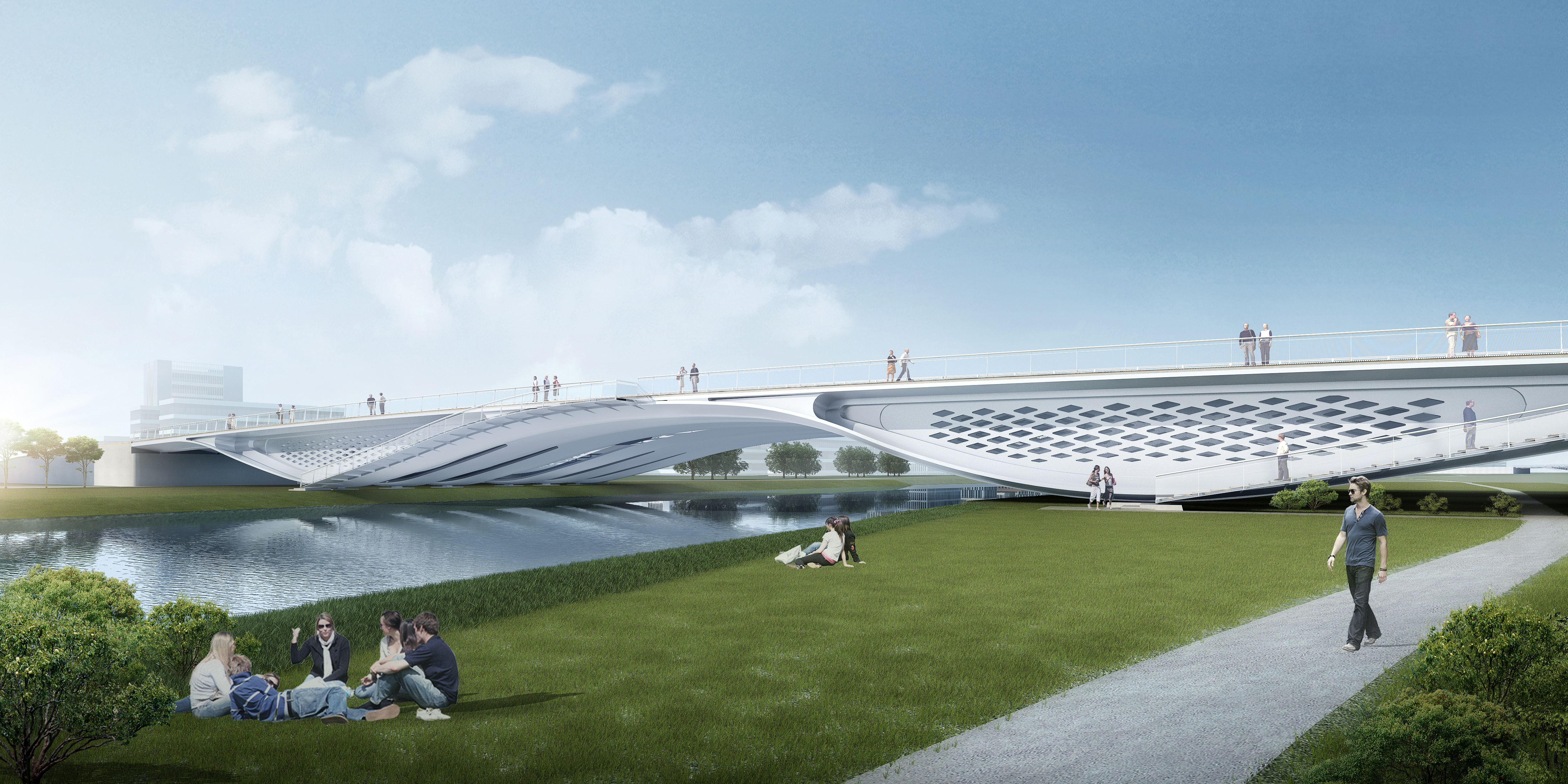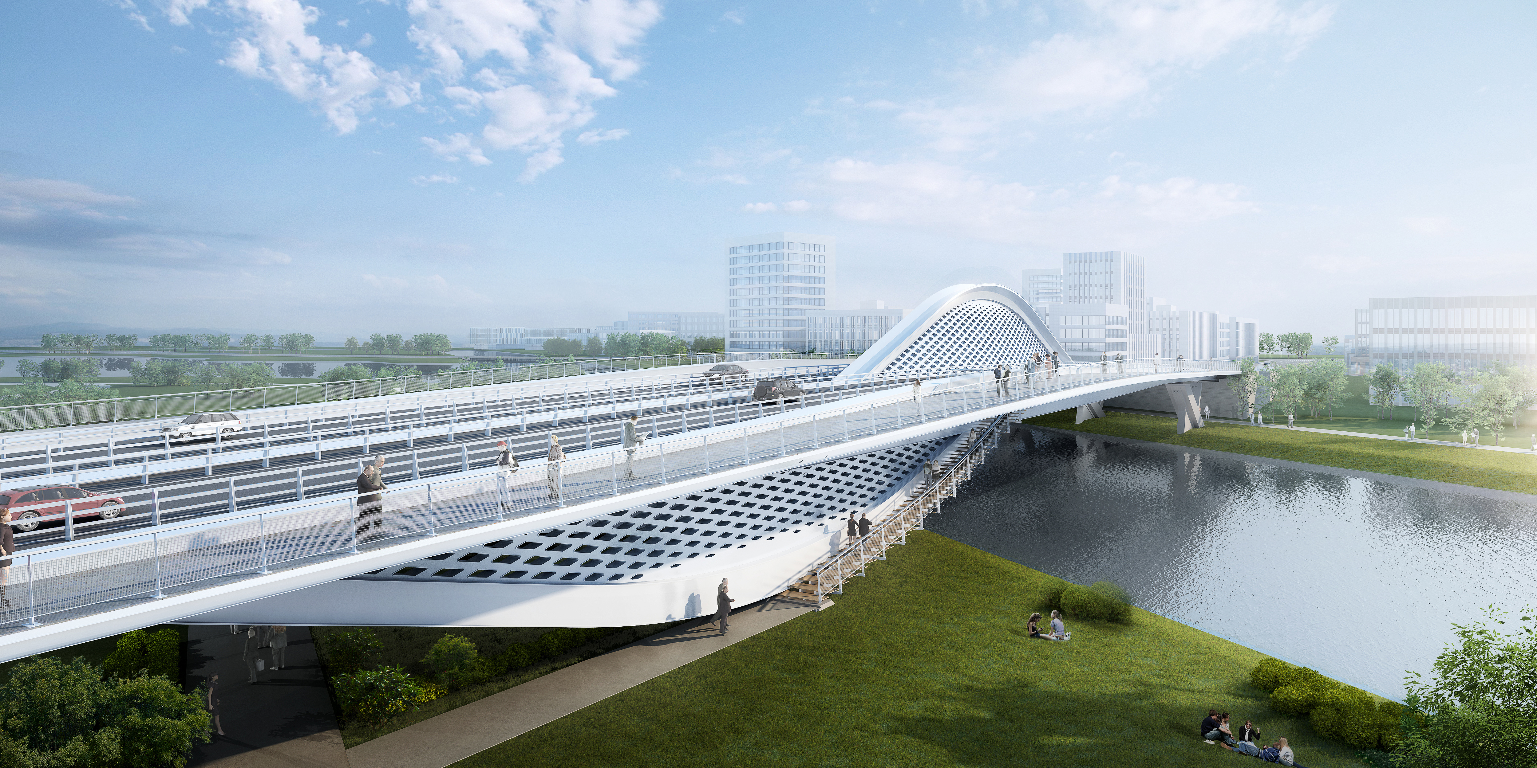 橫二路大寺河橋由世界著名橋梁設計師Marc MIMRAM先生主設計,由建設集團所屬濟南城建集團公司承建。橋梁全長150.16m,采用鋼結構梁拱組合體系一跨跨越大寺河,橋面總寬37m,道路寬度42m,雙向六車道,橋梁鋼結構總鋼材用量約4197噸。