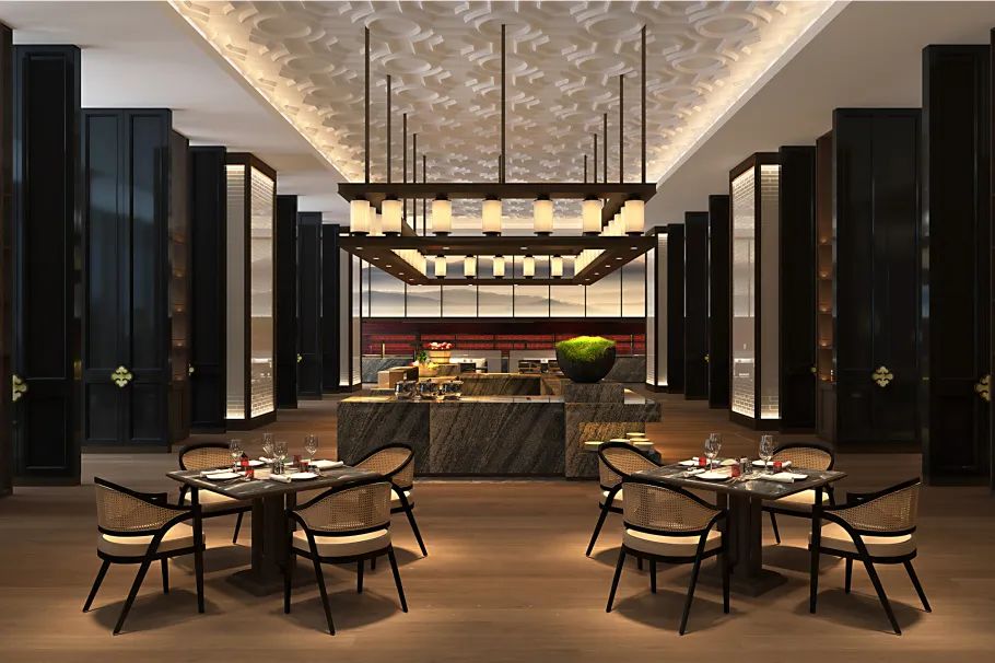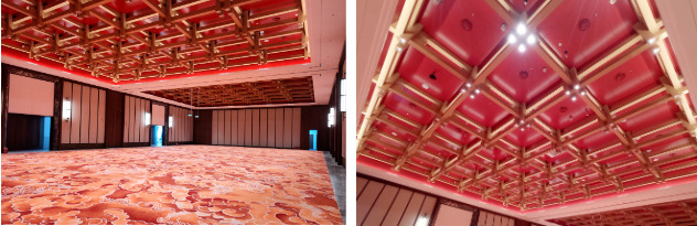 宴會廳天花的設計借鑒宋式屋架結構,通過現代設計手法進行簡化概括形成符合現代人審美的造型裝置藝術。