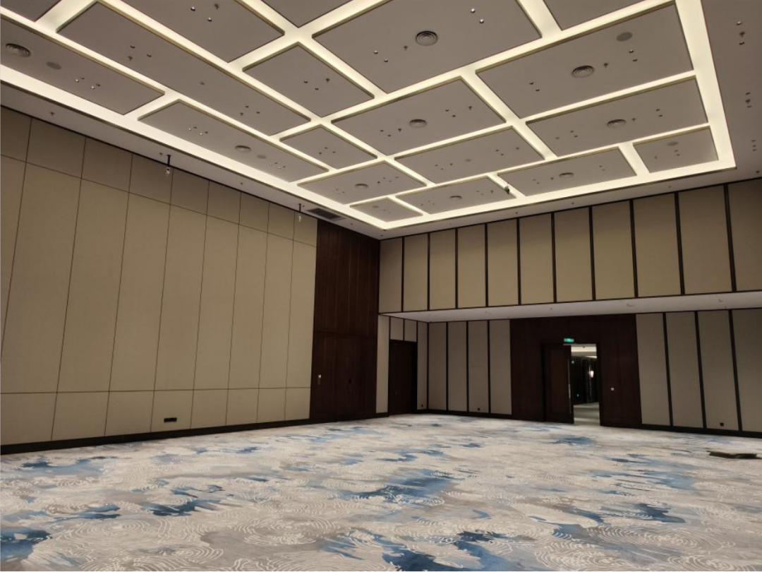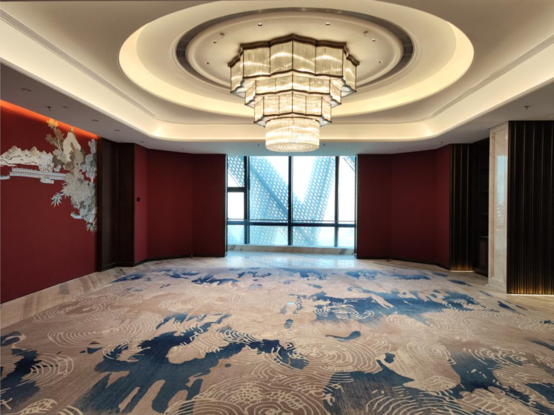 酒店大堂和過廳吊頂為異型鋁型材格柵吊頂,大宴會廳吊頂為多層鋁方通交錯布置造型,項目團隊使用BIM建模技術,優化施工工藝提高了施工效率,僅此一項節省工期30天,項目團隊群策群力科學組織各項施工,7天完成地毯鋪裝18000平方米,10天完成墻面硬包安裝20000平方米,40天完成大理石鋪貼和干掛施工3.4萬平方米,項目如期通過驗收,為酒店開業奠定堅實的基礎。