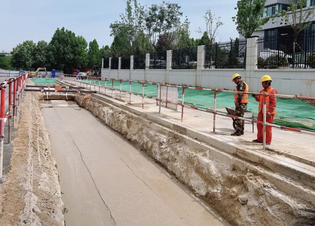 在濟南高新區章錦片區路網完善工程總承包項目創新應用新型材料流態固化土,利用工程棄土摻入一定量的專用固化劑加水拌合均勻后形成可泵送、自流平、自密實且凝固后能達到一定強度的新型建筑材料,具有施工速度快、耐久性強,收縮性小、滲透性低,物盡其用、變廢為寶等優勢。