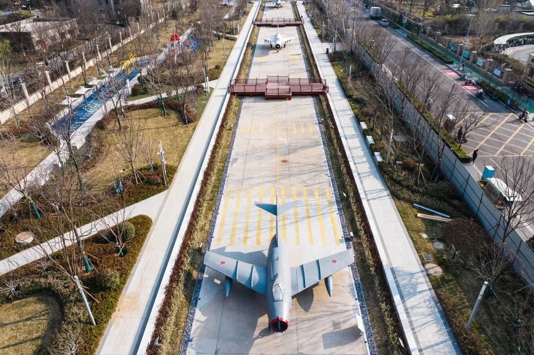 公園南區(qū)入口打造文化長廊,通過展示中國戰(zhàn)機發(fā)展史讓市民了解空軍文化;結(jié)合原有170米長水泥跑道,通過景觀手法進行二次設(shè)計,融合機場跑道符號、導(dǎo)航等設(shè)施還原機場跑道場景,沿跑道科普展示曾在張莊機場服役的戰(zhàn)機模型,進行航空科普、國防軍事及愛國主義教育。