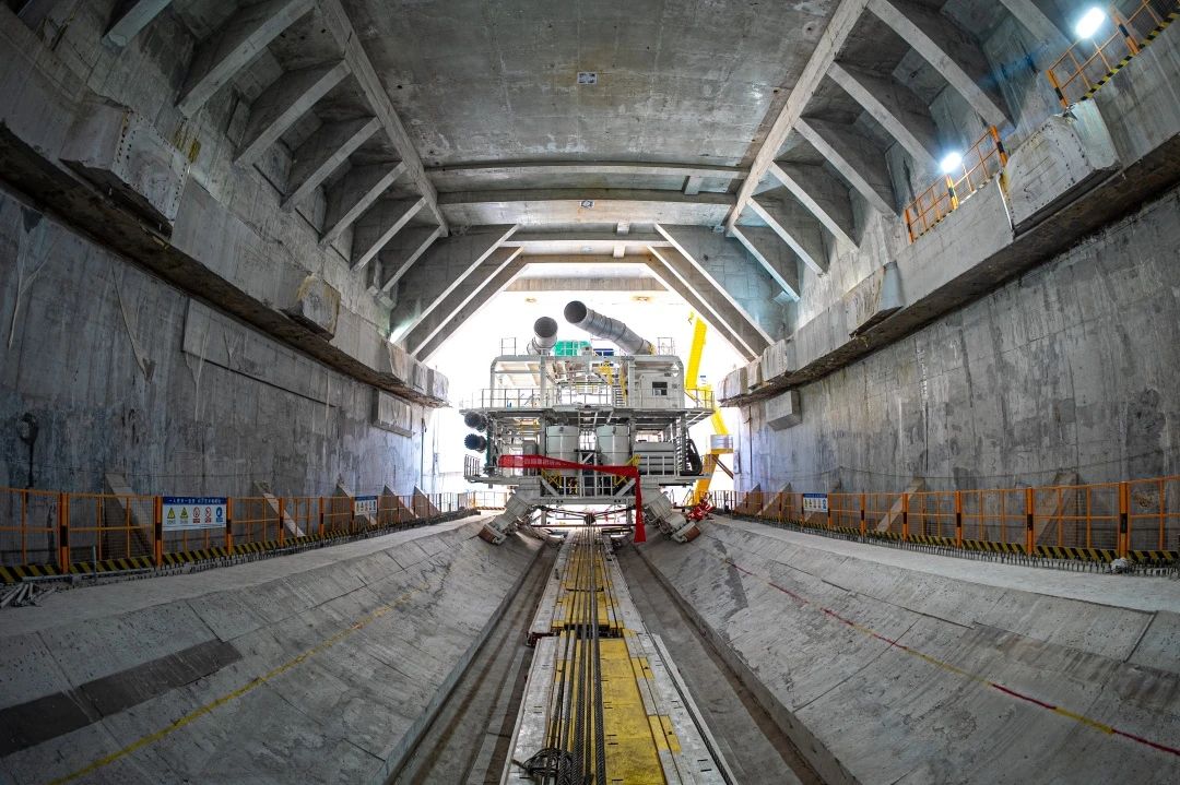 目前,“山河號”盾構機一號臺車已下井,重510噸,長約30米,是“山河號”盾構機后配套臺車中最大、最關鍵的一節。整個后配套臺車為三層框架結構,搭載盾構機掘進的主要設備,配置有盾構機駕駛室、供電設施、泥漿環流系統組件、液壓泵站組件和同步雙液注漿系統組件,吊裝施工以后、中、前的順序,由800噸履帶吊從始發井端頭依次吊裝下井進行組裝。