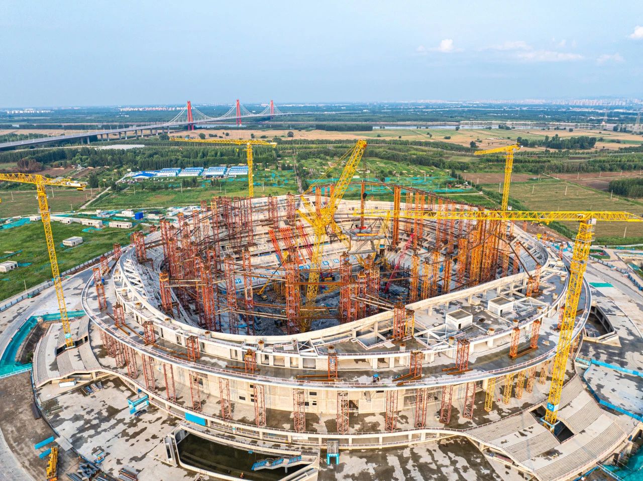 7月4日,山東省首個(gè)6萬座專業(yè)足球場——濟(jì)南黃河體育中心專業(yè)足球場項(xiàng)目屋蓋鋼結(jié)構(gòu)第一榀桁架吊裝正式起吊,標(biāo)志著這座世界首個(gè)具有最大懸挑鋼屋蓋、最大單層PTFE覆膜的鋼-索-膜混合空間結(jié)構(gòu)建筑,從設(shè)計(jì)理論走向?qū)嵺`,全面進(jìn)入屋蓋鋼結(jié)構(gòu)施工階段。