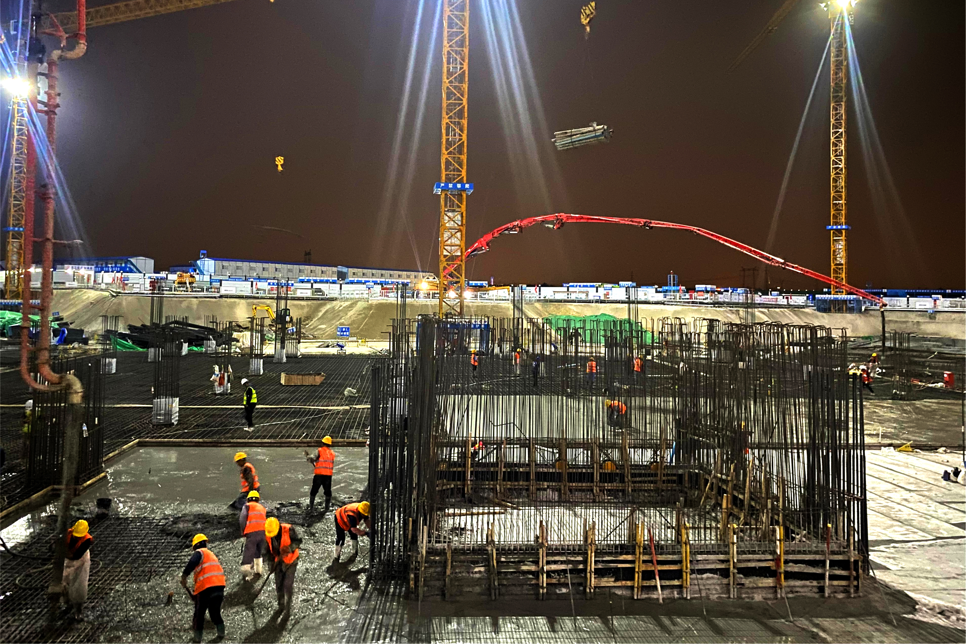 本次筏板混凝土施工使用2臺84米汽車泵進行澆筑,歷時30小時,共計澆筑混凝土1752立方。施工澆筑跨度大、項目標準高,項目部提前策劃,精準分析施工重點難點,明確質量及安全保證措施,做好各項突發事件的應急預案。對防水施工、模板標高、鋼筋保護層厚度等關鍵環節進行細致的檢查和驗收,嚴格按照施工規范進行操作,確保澆筑的順利完成。