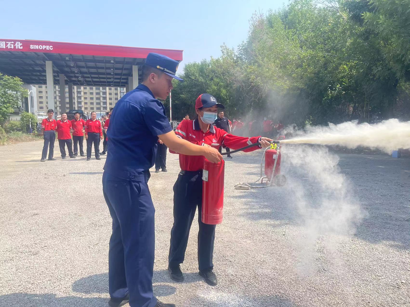 消防實戰演練選取了加油機起火應急突發事件進行演練。演練前槐蔭區消防中隊郭良俊隊長講解了加油站消防安全注意事項、滅火器器材的使用及火災撲救方式等消防知識,并演示了消防器材的操作方法。