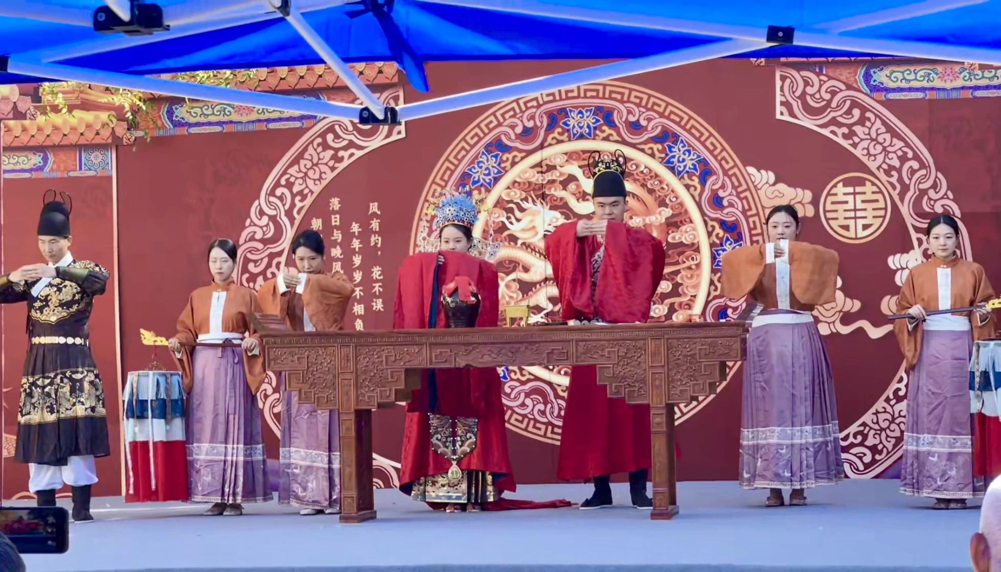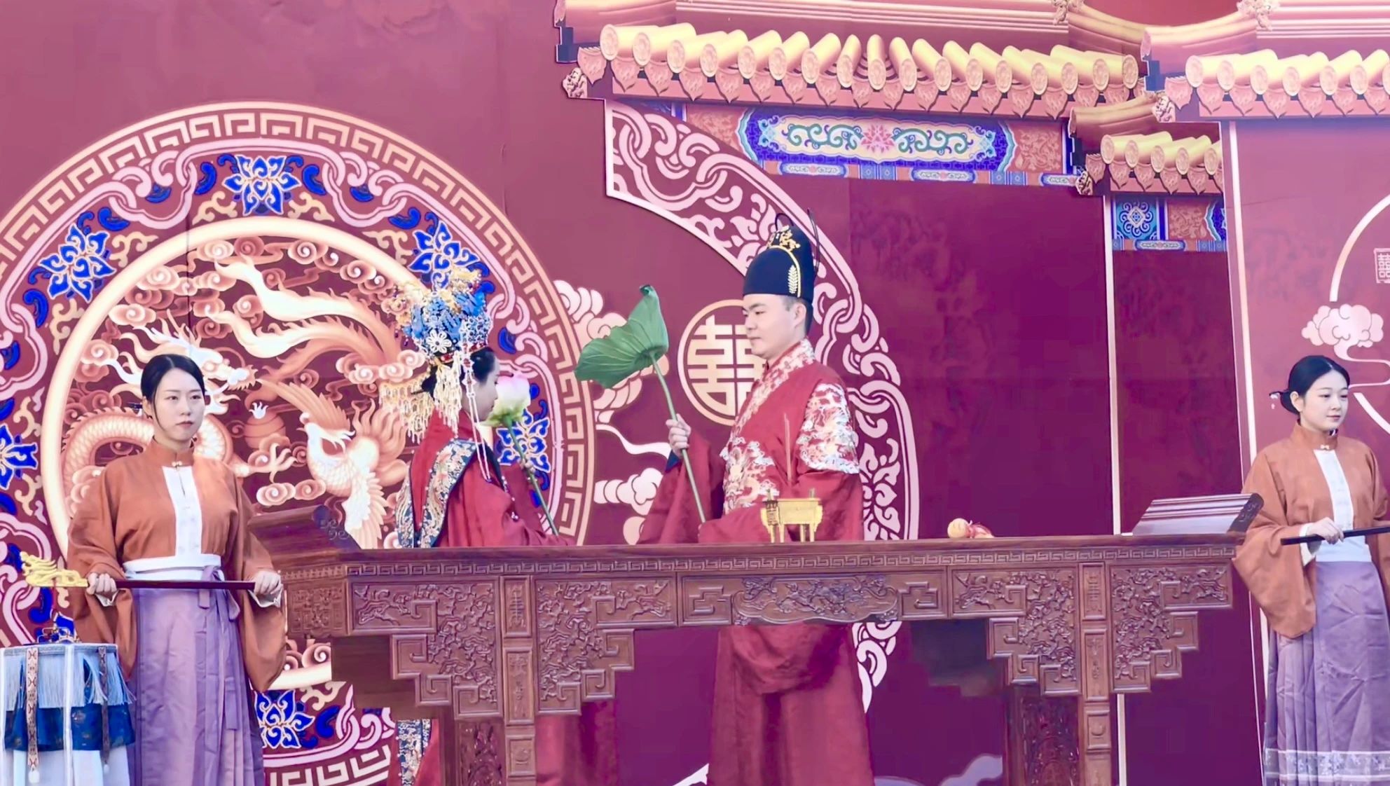 “山河月明”羅芙威宮中式婚禮展演,盛世華禮、古韻十足,演員們身著華彩衣裝,恍若穿越千古時光翩翩而來,在印象濟南·泉世界東門主街,帶領市民游客沉浸式體驗中式婚禮的浪漫。
