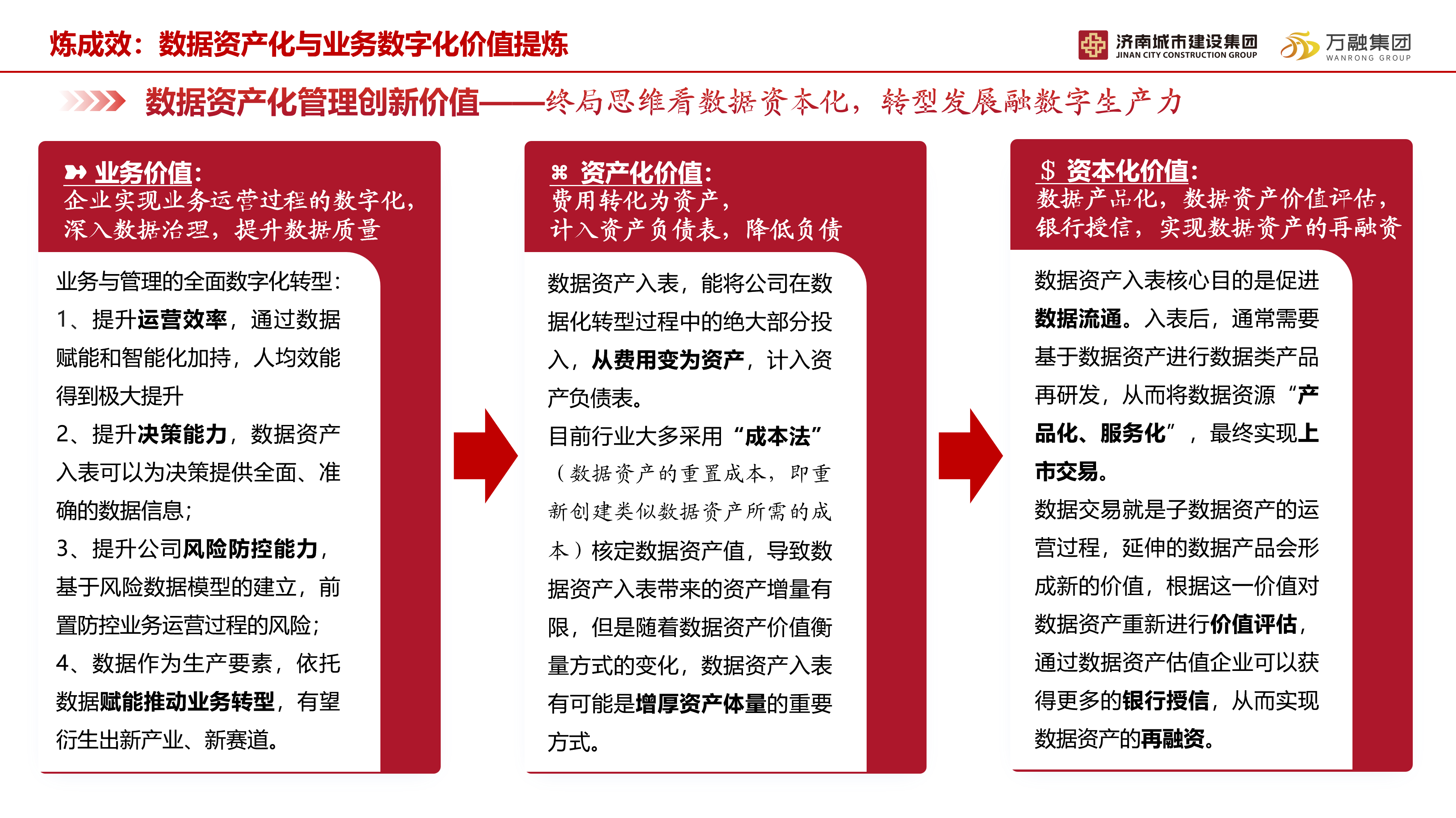 該數(shù)據(jù)集的應(yīng)用在規(guī)避無效成本投入、降低綜合造價(jià)、保障項(xiàng)目開發(fā)收益方面發(fā)揮了重要作用。通過數(shù)據(jù)分析,實(shí)現(xiàn)資源配置優(yōu)化,推動(dòng)流程再造,提升成本管控效率和質(zhì)量。同時(shí),結(jié)合數(shù)據(jù)資產(chǎn)入表的全過程,數(shù)據(jù)資產(chǎn)入表對(duì)萬融集團(tuán)帶來了三層價(jià)值: