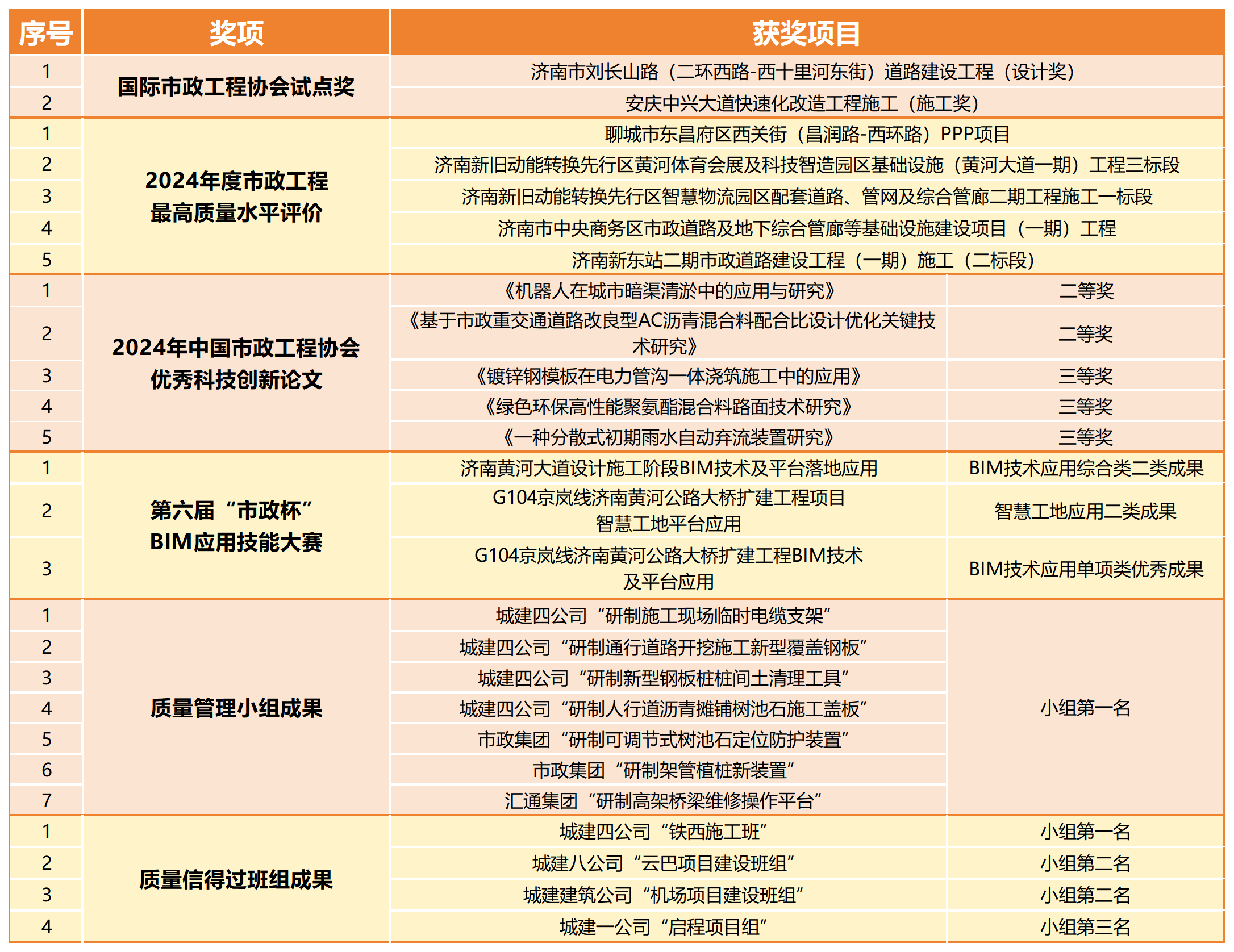 其中,濟南市劉長山路(二環西路-西十里河東街)道路建設工程等2項工程獲評“國際市政工程協會試點獎”;聊城市東昌府區西關街(昌潤路-西環路)PPP項目等5項工程獲評“2024年度市政工程最高質量水平評價”;《機器人在城市暗渠清淤中的應用與研究》等5篇論文獲評“中國市政工程協會科技創新論文”并入選《中國市政工程協會科技創新論文集》;城建集團公司3項成果獲評第六屆“市政杯”BIM應用技能大賽獎項,其中包括1項BIM技術應用綜合類二類成果、1項智慧工地應用二類成果、1項BIM技術應用單項類優秀成果;“研制施工現場臨時電纜支架”等7項質量管理小組成果獲評小組一等獎第一名;“云巴項目建設班組”等4項班組成果獲評全國市政工程“質量信得過班組”示范級班組前三名。