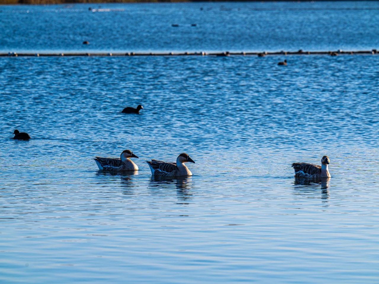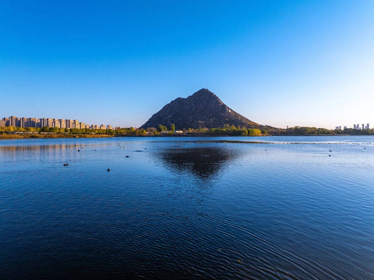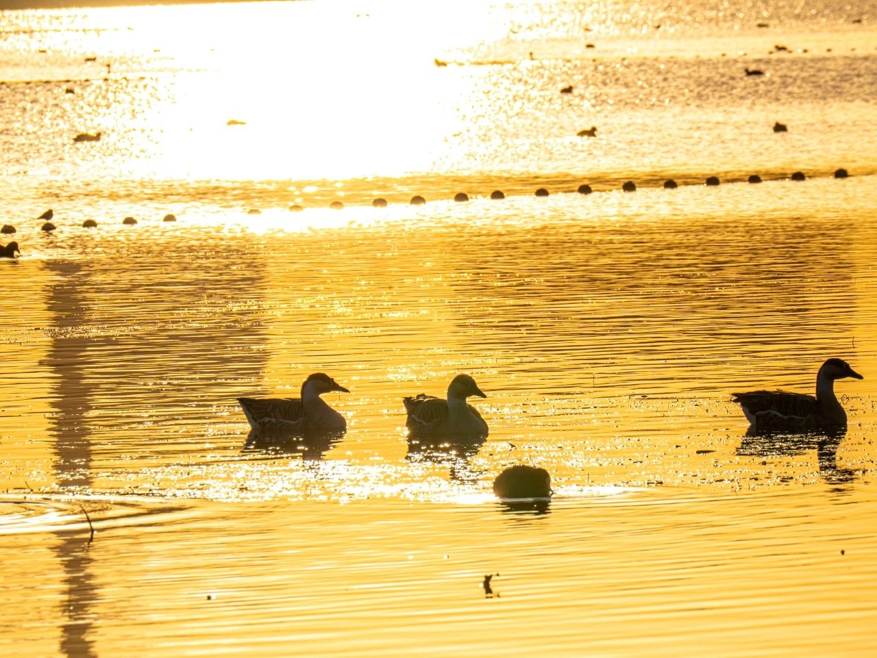 羽翼輕展映寒暉,群鳥嬉戲逐水歸。秋末冬初,上百只國家二級保護(hù)動物白骨頂雞如約來到濟(jì)南華山景區(qū)棲息,赴冬日的約定。