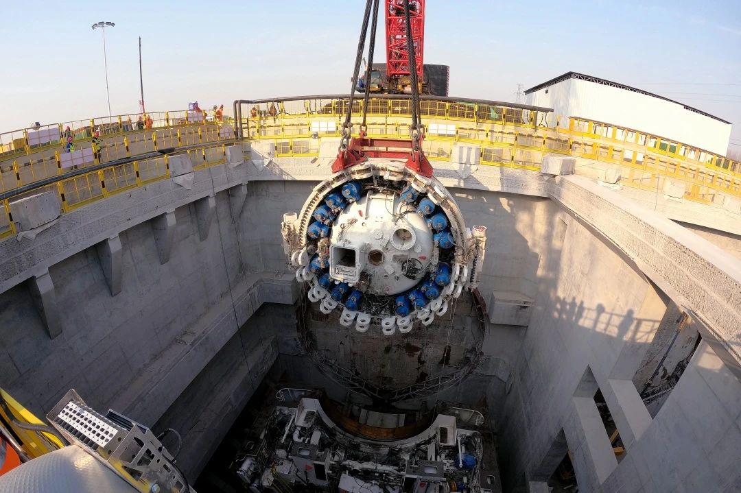 濟南市航天大道穿黃隧道(I期)全長約3.89公里,新建隧道約3.73公里,其中盾構段約3.25公里,采用雙管單層盾構形式,管片外徑14.5米,雙向六車道設計。目前,東岸圍護結構、土方開挖和主體結構施工完成,2月18日完成“啟航號”盾構機主驅動下井,盾構機總體組裝進度過半,配套設備組裝完成60%,進入了入地組裝的關鍵階段,接下來還將進行盾構機的刀盤下井吊裝工作,并全面開展盾構機始發前的整體安裝調試;南線盾構隧道始發基座、反力架基座施工,敞開段重載便道、接線道路復合地基加固和管線工程同步進行中;西岸圍護結構已完成,正在進行接收井基坑土方開挖及基坑砼支撐施工。