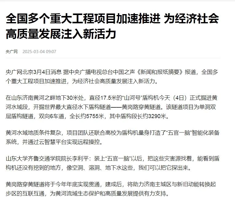 濟南廣電·叮咚FM客戶端3月4日訊 當前,濟南各重點項目搶抓春季施工“黃金季”,掀起如火如荼的施工熱潮。3月4日,中央廣播電視總臺中國之聲《新聞和報紙摘要》欄目聚焦各地重點工程建設加緊推進,為經濟發展注入新動能,播發了由濟南新聞綜合廣播記者協助完成的新聞,重點報道濟南黃崗路穿黃隧道項目建設進展和工程亮點。