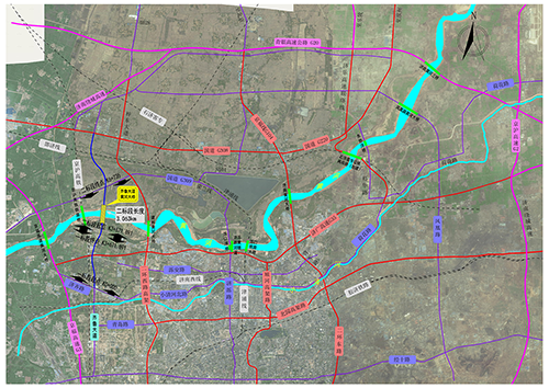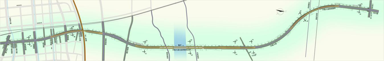 一標段南起現(xiàn)狀濟齊路,向北與虹吸干渠南路、虹吸干渠北路、吳家堡路、治黃路、規(guī)劃路相交,采用高架形式跨越太平河南支路、太平河北支路、美里路、太平河北路、濟廣高速后,在美里湖路前落地,高架橋兩側(cè)設(shè)置一對輔道實現(xiàn)各交通流向的轉(zhuǎn)換,終點接黃河大橋引橋,平面線位與規(guī)劃線位一致,道路全長3671.89米。